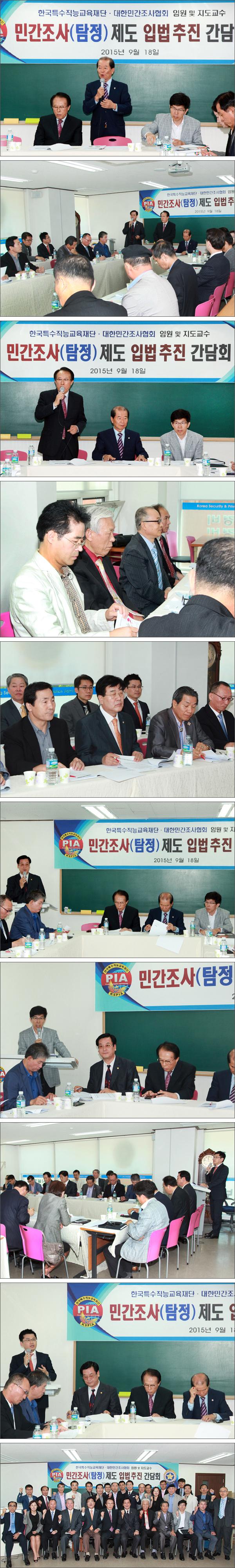 지난 9월 18일 '민간조사업법 입법 추진을 위한 간담회'가 한국특수직능교육재단/대한민간조사협회 임원 및 지도교수, 관련기관 단체장 등 약 40여명이 참석한 가운데 본 교육재단/협회 대회의실에서 개최되었습니다.