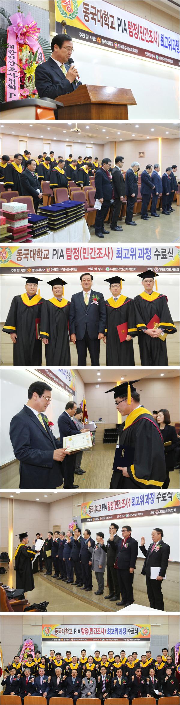 2017년 3월 17일(금요일) 서울 동국대학교 학술관 학명세미나실에서 관련기관 단체장은 물론, 정·재계, 학계, 지도교수 등이 참석한 가운데 동국대학교 PIA 탐정(민간조사) 제63기 최고위과정 수료식이 거행되었습니다.
