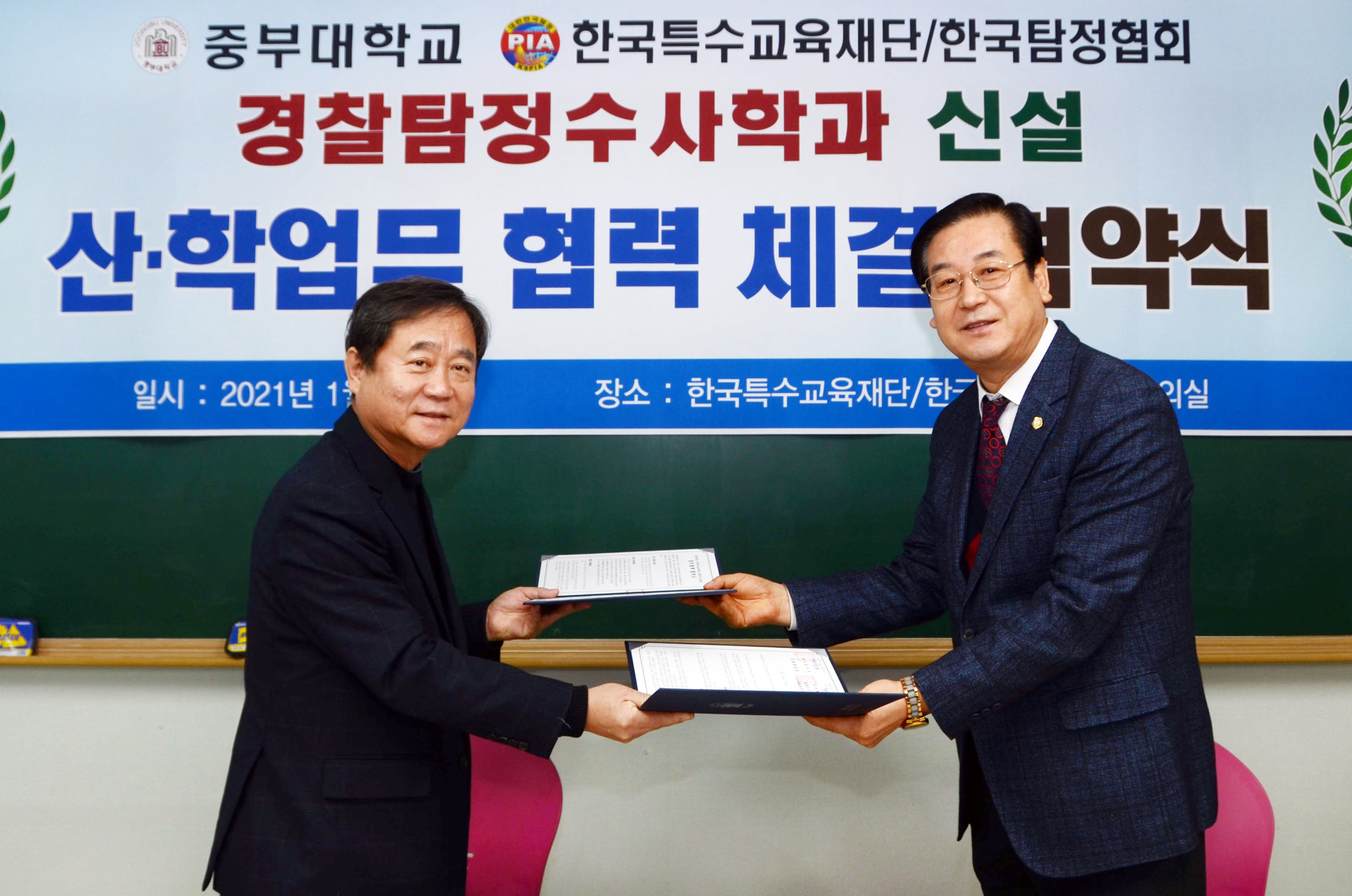 한국특수교육재단/한국탐정협회 하금석 회장과 중부대학교 경찰경호학부 서진석 학과장은 지난 1월 8일 종로 대한민간조사협회 대회의실에서 경찰탐정수사학과 신설에 관한 업무제휴 협약식을 거행하였습니다. |