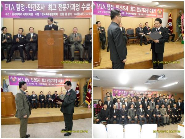 한국특수행정학회 주관하며 동국대학교 사회교육원에서 실시한 PIA 탐정 민간조사 최고위과정이 2010년 3월 13일 토요일 오후1시에 동국대학교 문화관 1층 덕암세미나실에서 수료식이 진행됐다.
