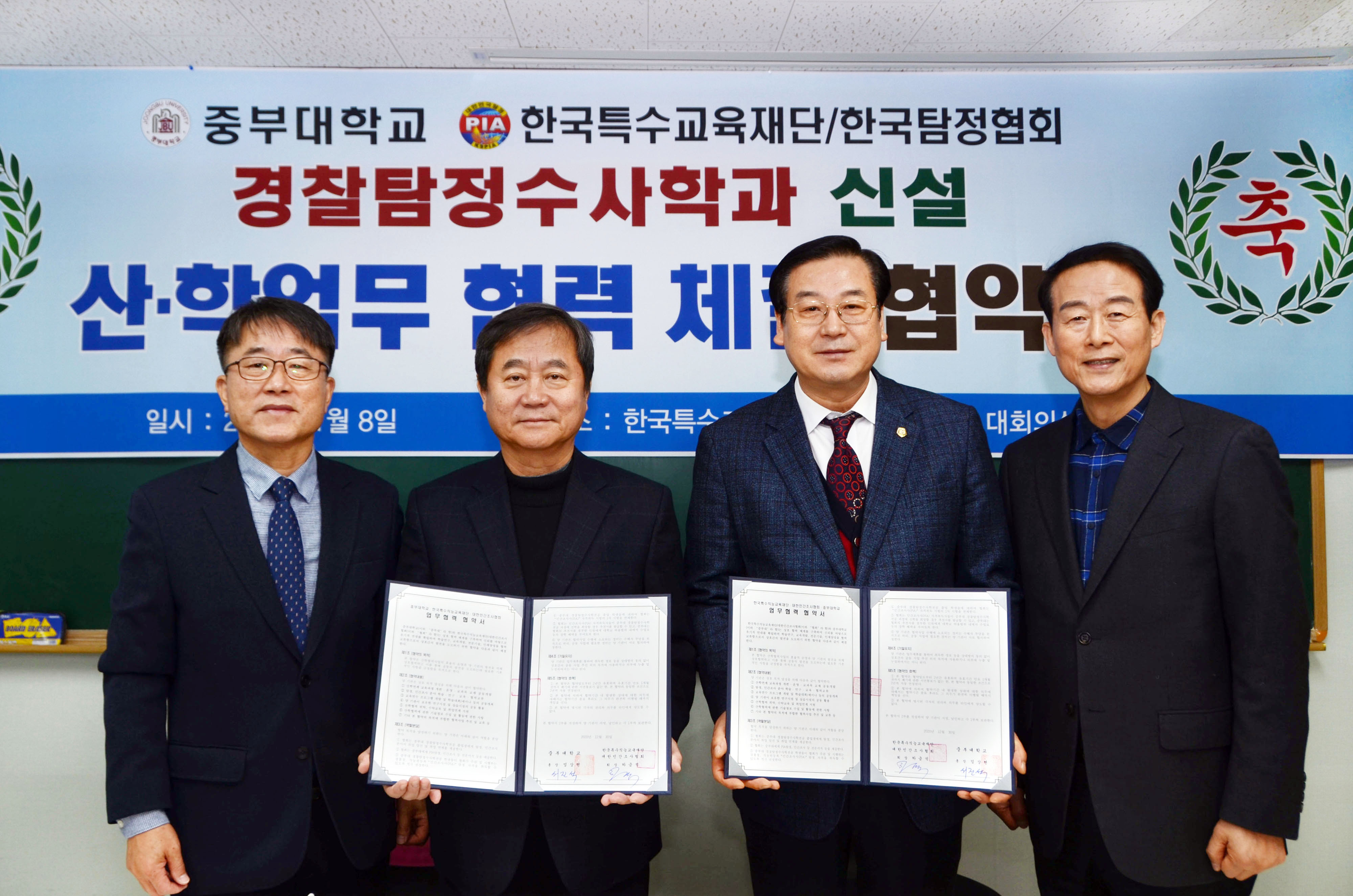 한국특수교육재단/한국탐정협회 하금석 회장과 중부대학교 경찰경호학부 서진석 학과장은 지난 1월 8일 종로 대한민간조사협회 대회의실에서 경찰탐정수사학과 신설에 관한 업무제휴 협약식을 거행하였습니다. |